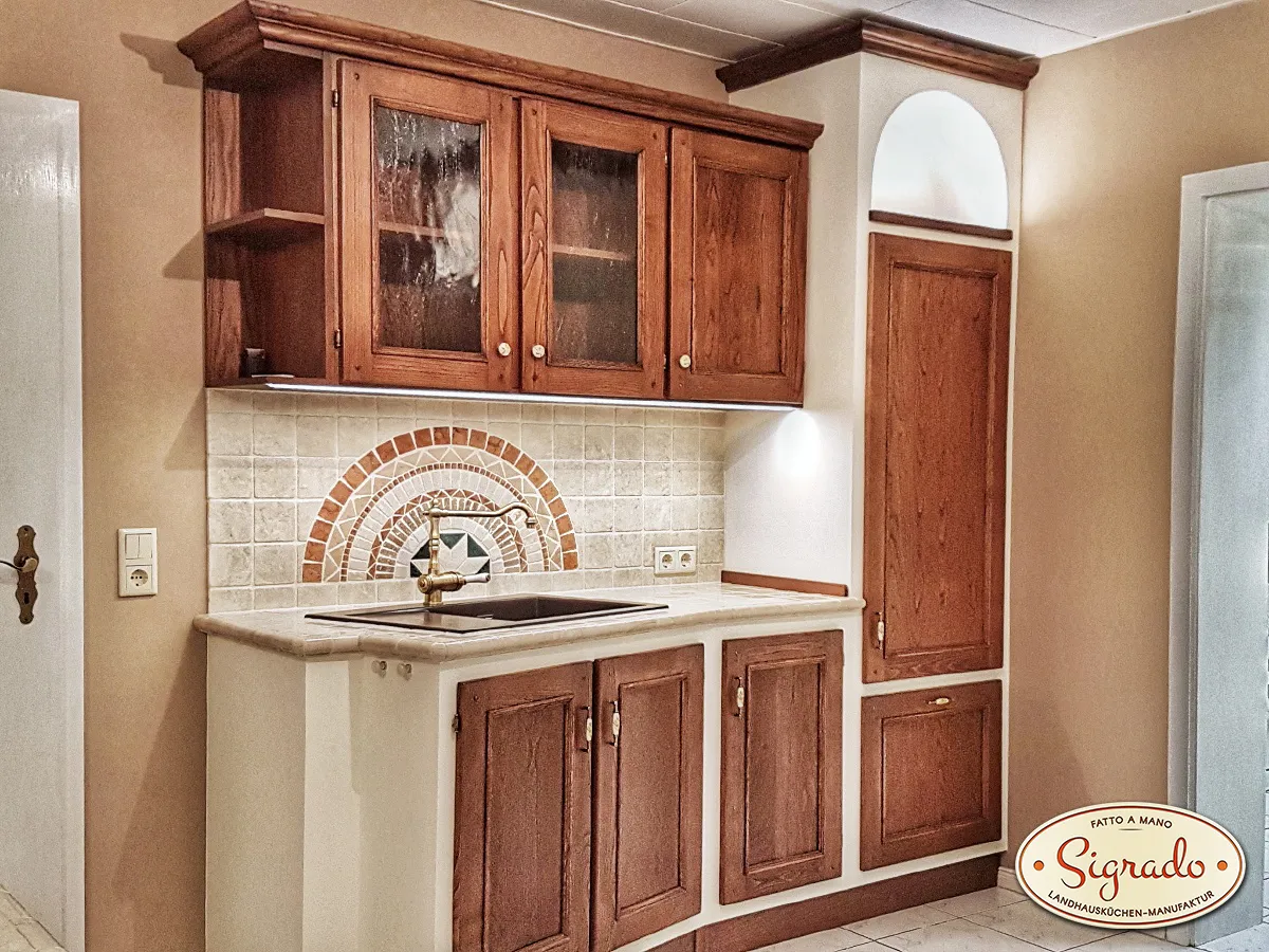 Unsere Küchen sind keine improvisierten DIY-Mauerwerke, sondern maßgefertigte Möbelstücke mit einem bewusst eingeplanten Zwischenraum zwischen den Fronten. Dieser Zwischenraum wird nach der Montage mit einer strukturgebenden, abwaschbaren Farbe gestaltet, die optisch wie verputztes Mauerwerk wirkt. So entsteht die charakteristische Mäuerchen-Optik, die sich farblich individuell zur Front absetzen lässt und eine authentische Zweifarbigkeit erzeugt. Das Ergebnis ist eine Küche mit mediterranem Charakter, die nicht nur emotional anspricht, sondern auch funktional überzeugt – mit vollem Stauraum, langlebigen Oberflächen und einem Design, das deutsche Tischlereien in dieser Form nicht anbieten können. Jede Sigrado Küche ist ein Unikat mit Seele – und ein klares Statement für Charme und Substanz.