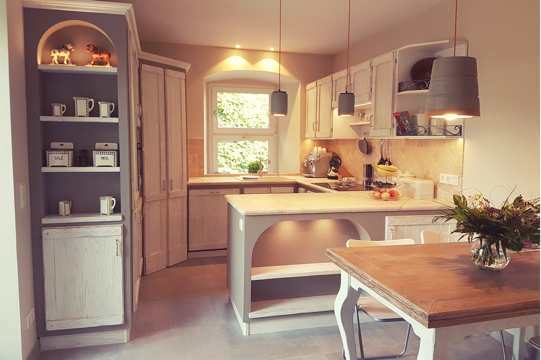 Alle Sockel- und Kranzleisten, Zier- und Wischleisten, Hängeschränke, Zierelemente und sogar der Küchentisch mit Stühlen werden passend zu deiner Front gefertigt.